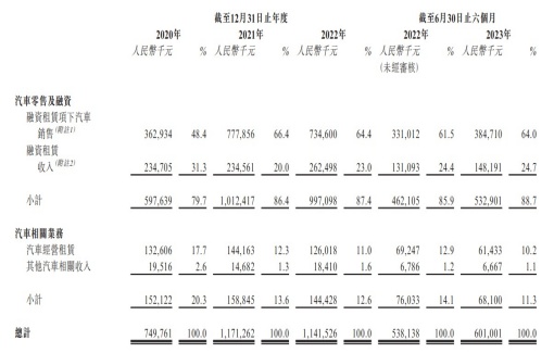 其中,汽车零售及融资业务是公司的主要收益来源,于截至2020年、2021年及 2022年12月31日止年度及截至2023年6月30日止六个月分别占收益总额的79.7%、 86.4%、87.4%及88.7%。