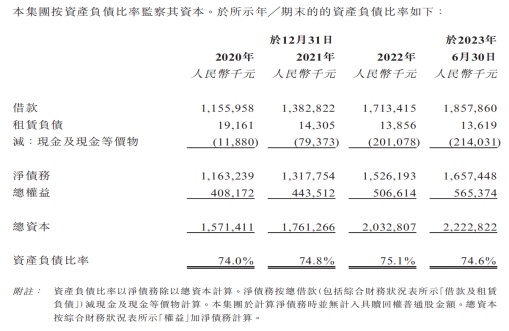 智通财经APP注意到,喜相逢的资产负债比率长期居于高位。2020年、2021年、2022年及截至2023年6月30日止六个月,公司资产负债比率分别达到74%、74.8%、75.1%和74.6%;同期借款金额分别达到11.56亿元、13.82亿元、17.13亿元和18.58亿元,融资成本分别为9870万元、1.09亿元、1.31亿元及7600万元,分别占公司相应期间融资租赁收入的42%、46.4%、50.1%及51.3%。