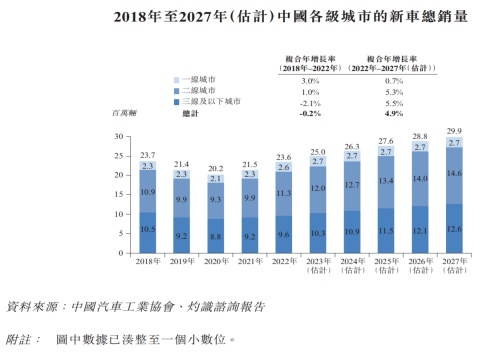 零售汽车融资市场于过往五年经历温和增长时期。按新车及二手车的贷款量计算,市场规模由2018年的1100万宗增至2022年的1360万宗,复合年增长率为5.6%。受惠于政府政策、汽车需求不断上升以及多元化的汽车融资产品,预计零售汽车融资市场的贷款宗数于未来五年将继续增加,于2027年将增至2930万宗。