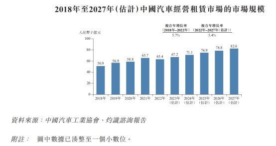 中国汽车经营租赁市场于过往年度急速扩展,按商品交易总值计的市场规模由2018年509亿元增至2022年634亿元,复合年增长率为5.7%。随着网约车平台发展、自驾旅程的消费增加及有利政策改革,中国汽车经营租赁市场的市场规模预期将于2027年增至826亿元,2022年至2027年的复合年增长率为5.4%。