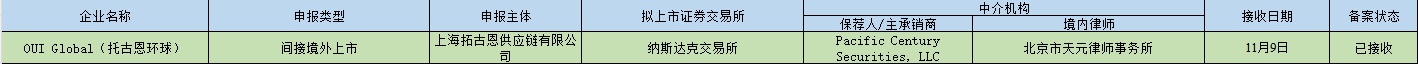 OUI Global(托古恩环球)的申报类型为间接境外上市,备案接收日期为2023年11月9日,北京市天元律师事务所为其境内律师。