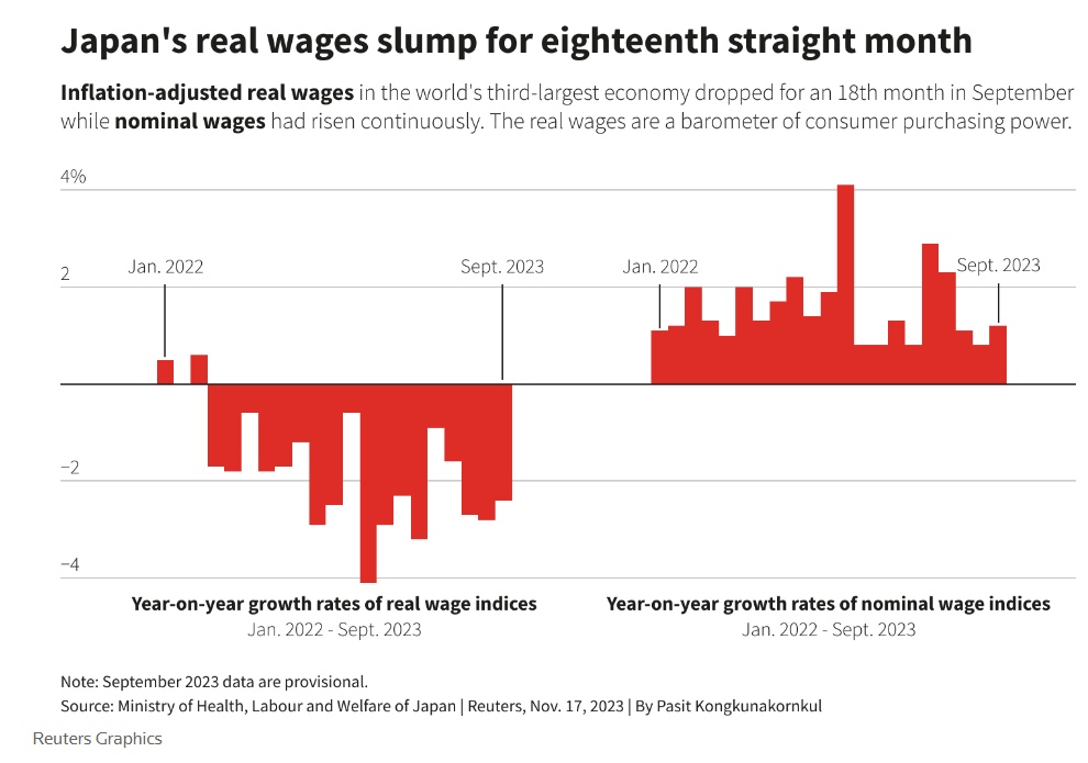 截至9月份,日本经通胀调整后的薪资已连续18个月下降。但预计日本大型企业的雇主们将同意在明年春季继续大幅加薪,其幅度甚至可能超过今年薪资涨幅,要知道一些日本大型企业今年薪资涨幅已创30多年来的最大幅度。