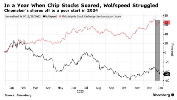 这家生产电动汽车和其他设备电源的芯片制造商是费城半导体指数中唯一一只在2023年下跌的股票。该公司迟迟未能推出一种更为先进的电动汽车芯片制造方法,这让投资者感到失望。Wolfspeed在纽约州北部的新工厂也一直无法达到满负荷运转。