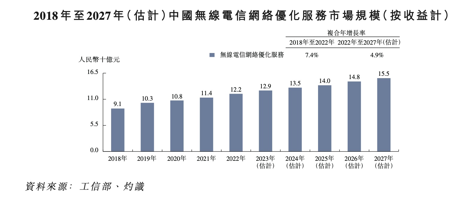 以中国无线电信网络优化服务市场为例,随着电信网络用户对优质移动网络质量的需求与日俱增,电信营运商在提升网络速度及稳定性方面投入巨资,其市场规模(按提供无线电信网络优化服务所产生收益计)由2018年的91亿元扩大至2022年的122亿元,复合年增长率为7.4%。
