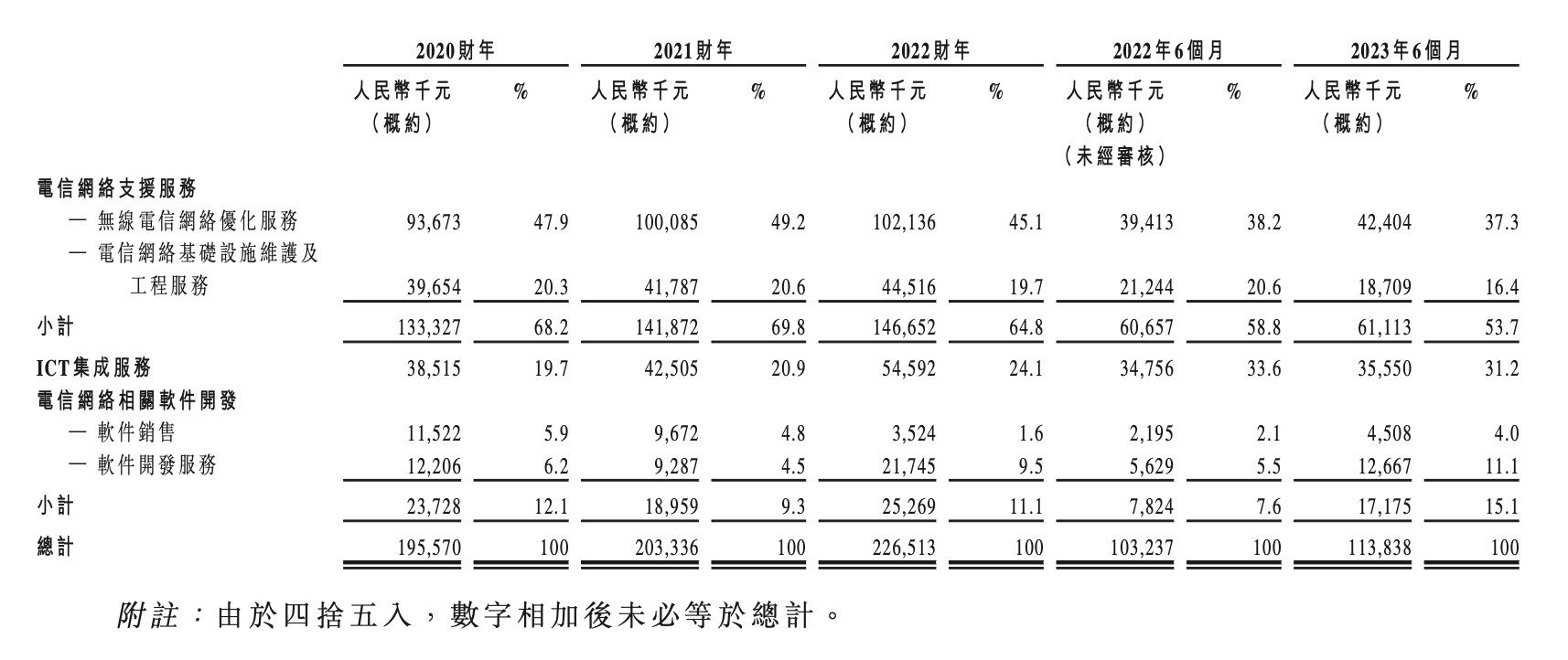 分业务来看,电信网络支援服务为公司的主打业务,其包括无线电信网络优化服务和电信网络基础设施维护及工程服务。以2023上半年为例,公司电信网络支援服务业务实现营收6111.3万元(人民币,下同),占比53.7%;公司第二大业务ICT集成服务业务实现收入3555万元,占比31.2%。此外,电信网络相关软件开发为公司的第三大业务,主要包括软件销售和软件开发服务两个子业务,该业务期内实现收入1717.5元,占比15.1%。