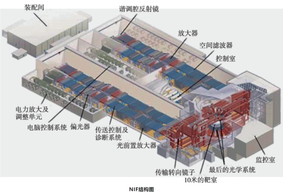 美国的NIF(国家点火装置)采用“惯性约束路线”制造,主要由两部分构成:一部分是高能量紫外激光器系统,一部分是靶室。激光系统主要由光脉冲发生器、放大器、驱动放大器的脉冲驱动系统、光学开关、光学聚能器以及激光束控制系统。通过高能量紫外激光器系统将主振荡器产生的低功率激光脉冲修正、充分放大后,准确地聚焦在微型氘氚靶丸上。