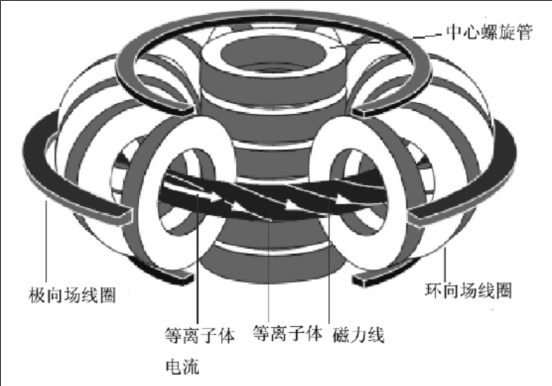 该路线的主攻方向之一是采用是托卡马克(Tokamak)装置。这是一种环形容器,用磁场形成一个“磁笼”将等离子体束缚住,创造氘、氚实现聚变的环境。这种装置又称环磁机,名字来源其关键词——环形(toroidal)、真空室(kamera)、磁(magnet)、线圈(kotushka)。