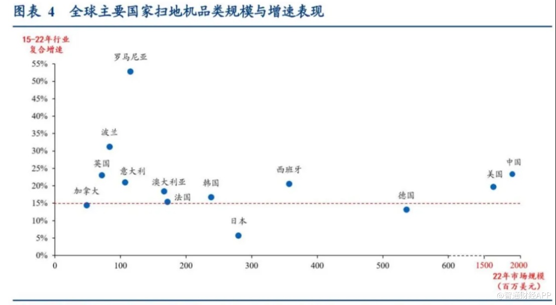 另据Euromonitor数据,15-22年间扫地机在主要发达国家的行业规模CAGR基本都维持在15%以上,其中中美两国作为全球扫地机最主要的市场,2022年销售规模均超过15亿美元,断崖式领先其他国家,而伴随扫地机在其他地区逐步起量,后续行业规模有望持续快速扩容。