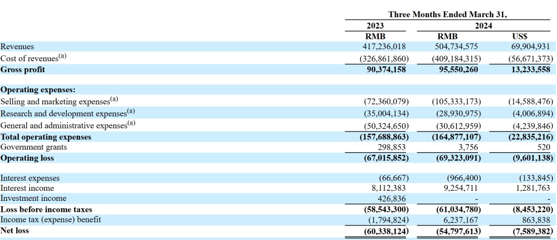 财报显示,小牛电动2024Q1季度的营收为5.05亿元,同比增长21%;当期净亏损为5480万元,较上年同期净亏损6030万元进一步收窄。