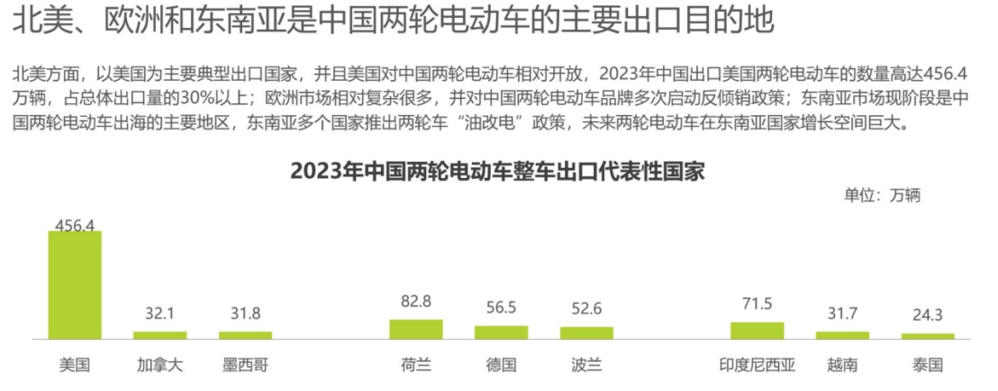 根据研究机构Market Research Furture发布《电动两轮车市场信息报告》指出,到2030年,两轮电动车市场规模将超过1000亿美元(约7000亿元人民币),2022年到2030年的年复合增长率为34.57%,这将是中国两轮电动车企业的新机遇。目前来看,北美、欧洲和东南亚是中国两轮电动车的主要出口目的地。北美方面,以美国为主要典型出口国家,并且美国对中国两轮电动车相对开放,2023年中国出口美国两轮电动车的数量高达456.4万辆,占总体出口量的30%以上。