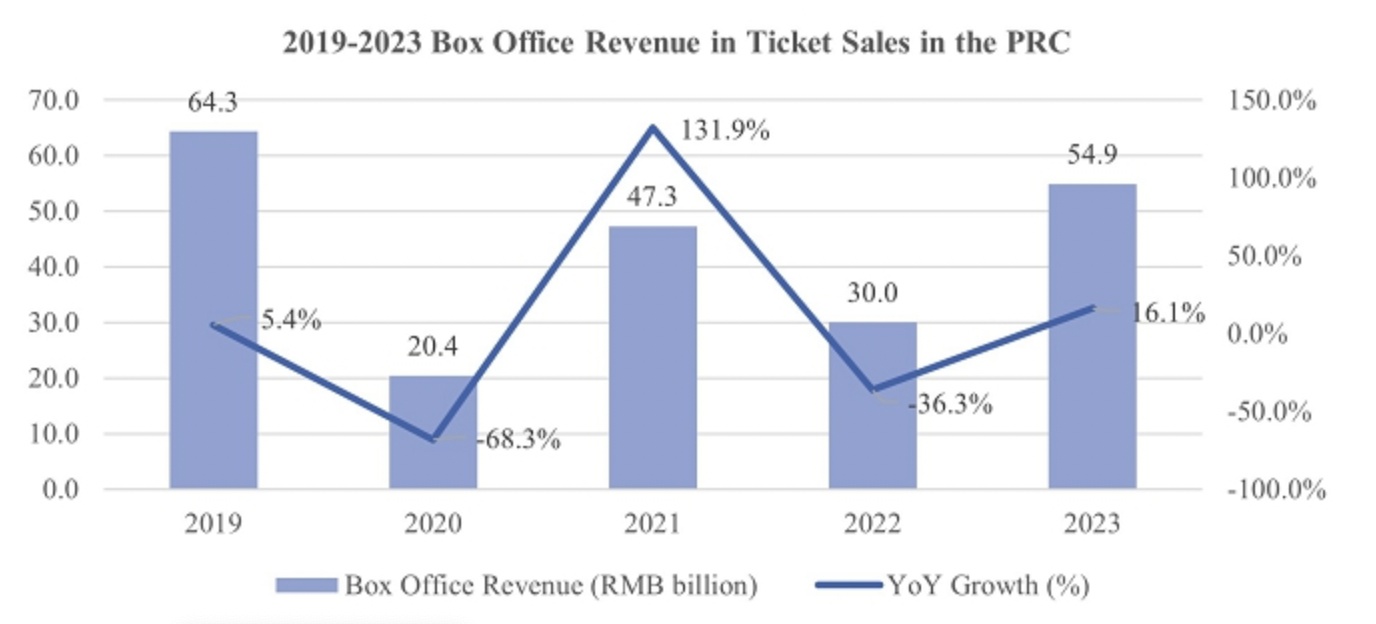 从票房表现来看,随着疫情逐步受到控制,我国电影院于2020年7月开始重新开放。据国务院数据,从2021年到2023年,中国的票房收入以39%的复合年增长率增长。2023年,我国票房收入达到549亿元,比2022年增长16.1%,继续引领全球票房市场。但相较于2019年642.7亿元的收入,行业市场尚未完全复苏。不过需要注意的是,据国务院数据显示,2024年春节假期的票房收入已打破了2019年春节假期59亿元的纪录。