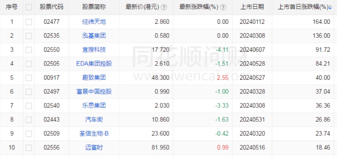 据智通财经APP统计,2024年至今(6月14日)港股共计上市26只新股上市。新股涨跌方面,暗盘大概约有17家上涨,1家平盘,8家下跌;首日则有有18家上涨,1家平盘,7家下跌,其中经纬天地、鸿基集团均暴涨超100%,宜搜科技大涨超90%,EDA集团控股则涨超84%,趣致集团上涨40%,这些个股在暗盘时分亦表现不俗。
