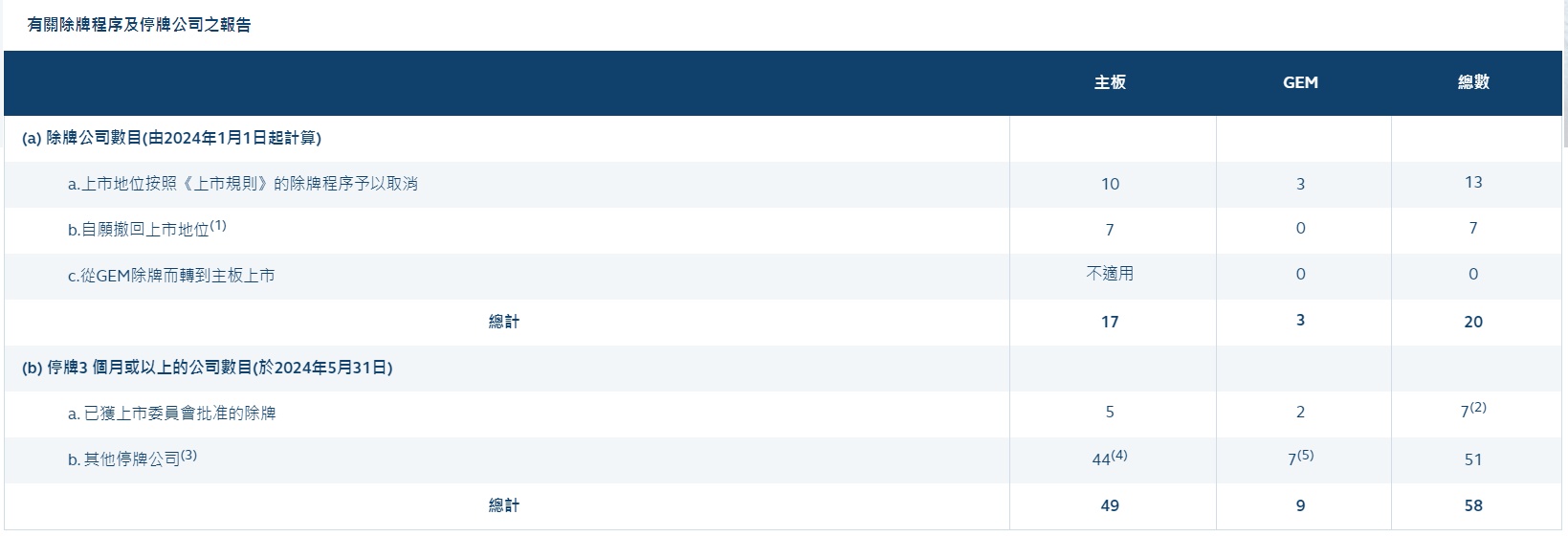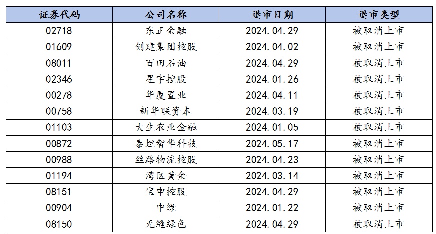 据港交所此前公告披露,2024年至6月11日,东正金融、创建集团控股、星宇控股、华厦置业、新华联资本、大生农业金融、泰坦智华科技、丝路物流控股、湾区黄金、宝申控股、中绿、无缝绿色等13家港股上市公司被取消上市地位。