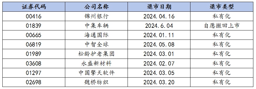 据智通财经APP统计,2024年至今,私有化退市成功的大概有7家企业,分别为锦州银行、海通国际、魏桥纺织、中智全球、松龄护老集团、永盛新材料、中国擎天软件。另外,还有A8新媒体(00800)、维达国际03331)、中国中药(00570)、赛生药业(06600)、欧舒丹等多家正处于推进私有化进程的相关股票。