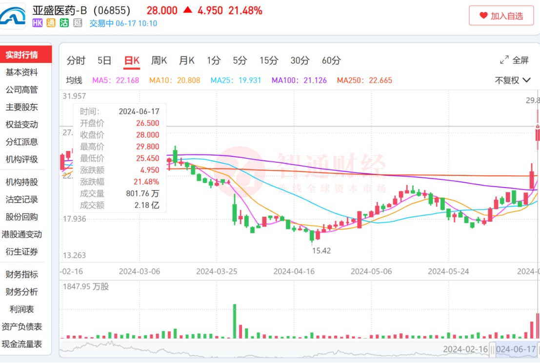 6月14日,亚盛医药盘后连发三则公告引发业界和市场的广泛关注。6月17日,亚盛医药港股股价更是大幅高开,早盘股价最高触及29.80港元/股,涨幅高达29.28%。