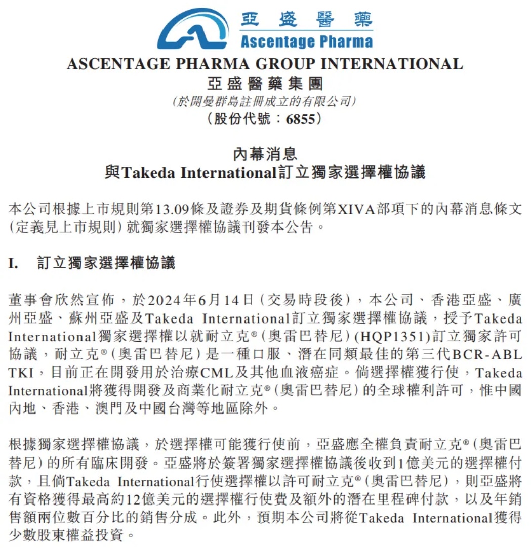 在二级市场为之震动的背后,最为重磅的消息莫过于,亚盛医药宣布与武田制药就公司第三代BCR-ABL抑制剂耐立克®(奥雷巴替尼)签署了一项总价达13亿美元的具有“高首付、高里程碑、高分成”特点的独家选择权协议。此次合作刷新了国内小分子肿瘤药BD交易金额的新纪录。