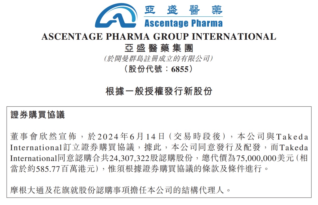 此外,武田制药还将投资7500万美元,溢价25%认购公司股份,成为亚盛医药重要的产业股东。