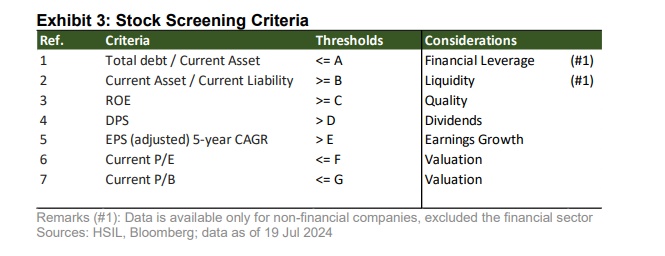 具体来看,恒指公司以包括优质性、财务杠杆、流动性、盈利增长、市盈率、市净率和股息率在内的7个条件从香港大市(以恒生综合指数为代表)中筛选满足相关参数的股票,剔除金融类个股共筛选出了36只。