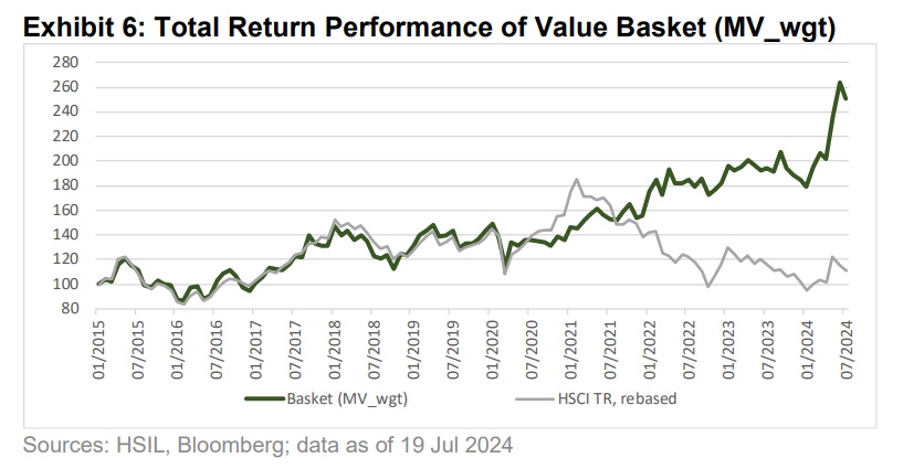 恒指公司对这36只一篮子价值股进行了十年期的回测,发现就年化总回报而言,动态的一篮子价值股(市值加权)表现跑赢大市8.6个百分点,展现出了明显的超额收益。