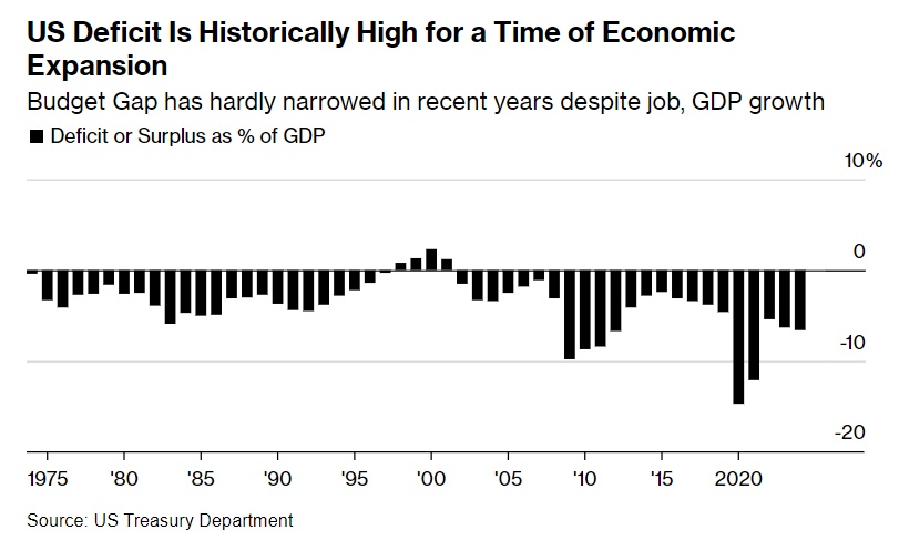 美国赤字在当前经济扩张时期处于历史高位——尽管就业和国内生产总值增长,但近年来赤字预算缺口几乎没有缩小