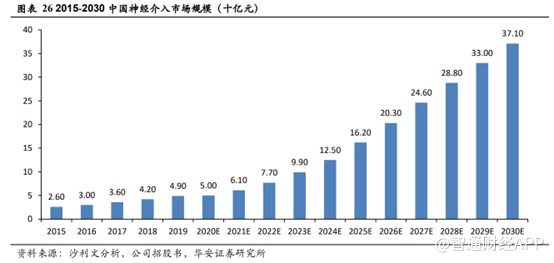 手术量的提升,推动行业快速扩容,据沙利文数据显示,中国的神经介入市场规模由2015年26亿人民币(单位,下同)增长至2019 年的49亿元,复合增长率达17.3%,预计2030年将增长至371亿元,2019-2030年复合增长率达20.2%。