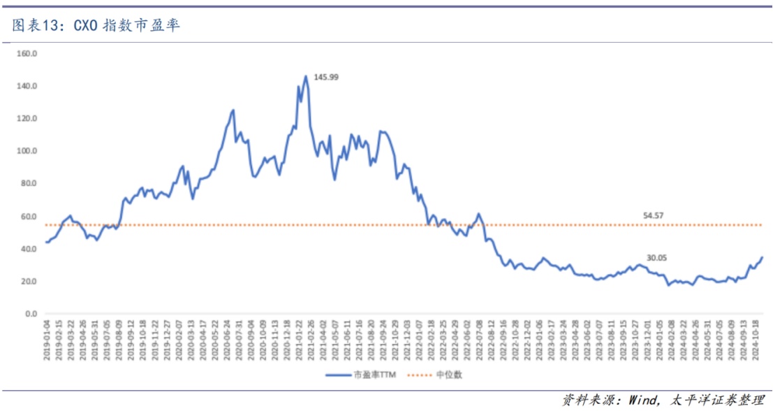 从A股CXO估值情况也可以体现出现。在经历一个月横盘震荡后,11月11日,CXO指数收于2253.98点,年初至今下跌9.12%,沪深300指数收于4104.05点,年初至今上涨19.61%。对应CXO指数PE为35.26倍,显著低于中位数54.57倍,仍处于低估值区间。而这已是10月初涨过一轮后的估值情况。