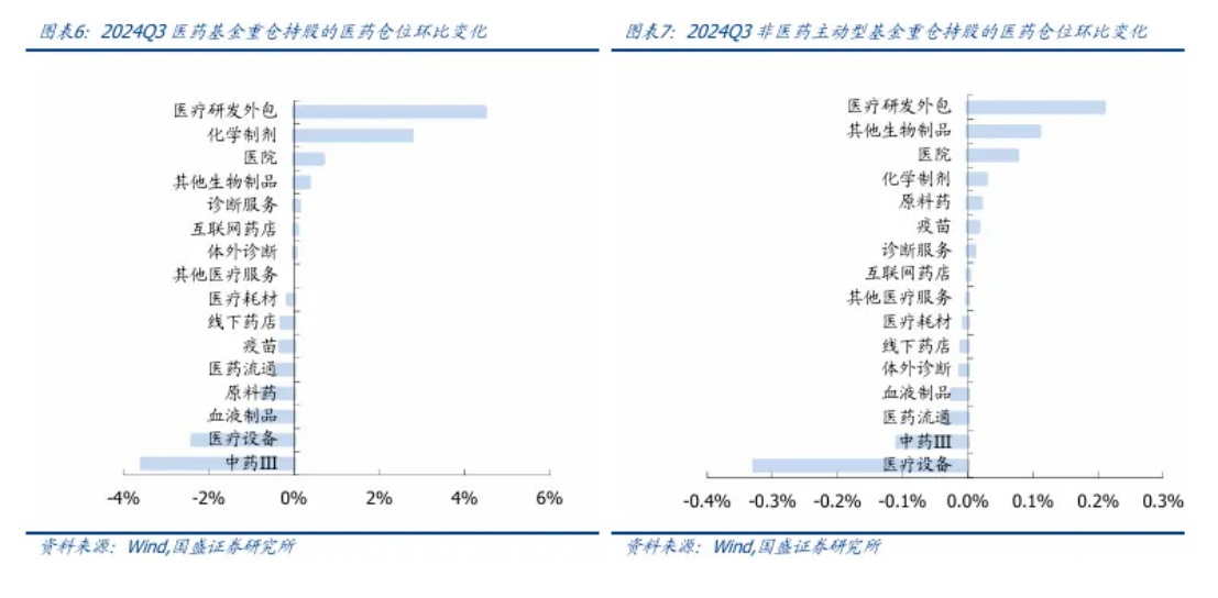 但随着头部CXO企业新冠商业化订单基本消化,地缘博弈的暂时落地,板块估值或有望得到重塑。今年Q3季度,公募重仓整体持有A股医药公司数和持有A股医药市值出现环比增加。对应子行业来看,则体现为医药基金和非医药主动基金仓位变化趋势相近,CXO、化学制剂、医院仓位提高明显;而从仓位环比变化来看,医药基金和非医药主动型基金仓位变化趋势同样相近,且因为CXO具备低估值特性,且明年业绩确定性较高,由此CXO仓位的提高均最为明显。