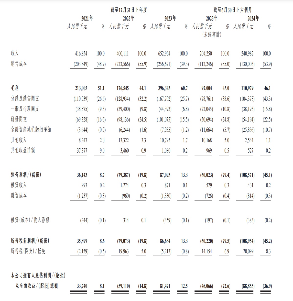 财务方面,于2021年、2022年、2023年、2024年截至6月30日止前六个月,该公司收入分别为人民币4.17亿元、人民币4亿元、人民币6.53亿元、人民币2.41亿元。同期,该公司的毛利分别为人民币2.13亿元、人民币1.77亿元、人民币3.96亿元、人民币1.11亿元。