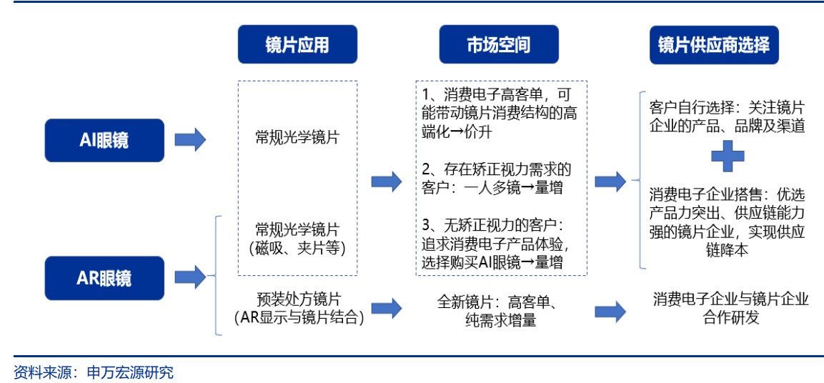 AI眼镜说到底是消费电子产品,而镜片是核心的上游供应链,联合研发是AI眼镜的趋势。申万宏源证券研报表示,AR显示与光学镜片结合的预装处方镜片依赖于消费电子和镜片企业联合研发,对镜片企业产品研发能力提出更高的要求,产品技术领先的镜片制造商有望脱颖而出,加速行业格局优化。