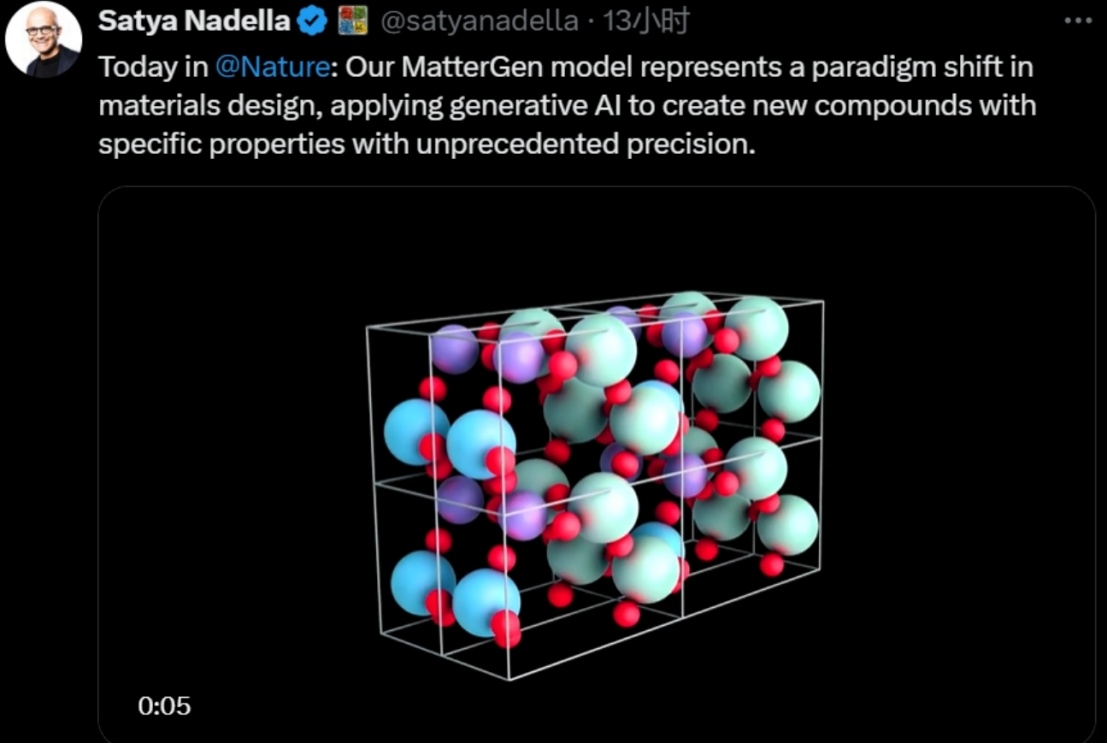 2025年1月16日,微软研究院 AI for Science的首席研发经理谢天和同事在最新发表的Nature论文中,展示了一款名为MatterGen的基于扩散的AI生成模型,该模型可以生成稳定、多样的无机材料,并可以针对逆向材料设计的广泛下游任务进行微调。微软公司CEO萨提亚·纳德拉(Satya Nadella)也专门在X介绍了该成果。