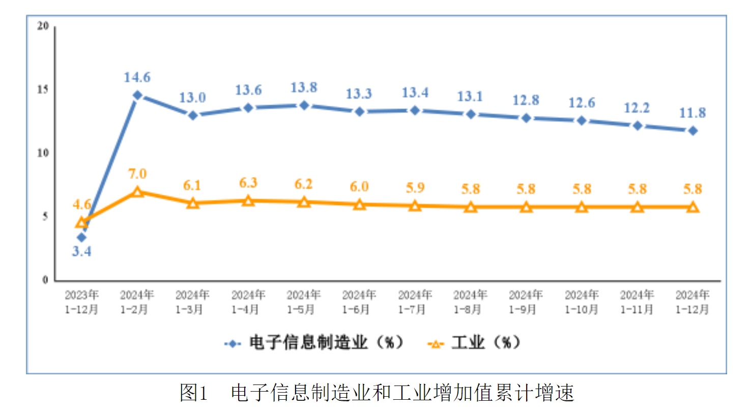 2024年,规模以上电子信息制造业增加值同比增长11.8%,增速分别比同期工业、高技术制造业高6个和2.9个百分点。12月份,规模以上电子信息制造业增加值同比增长8.7%。