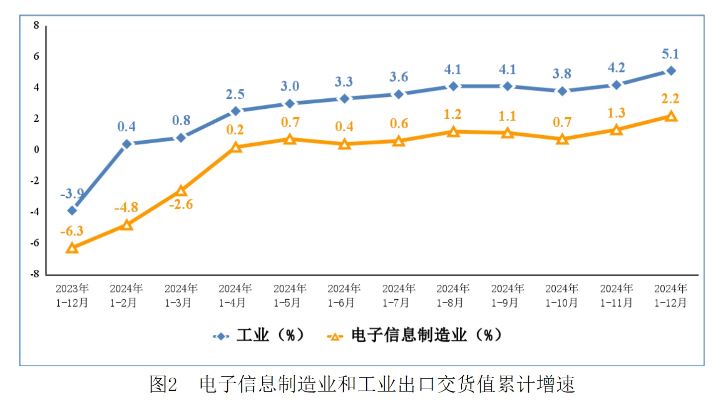 2024年,规模以上电子信息制造业出口交货值同比增长2.2%,较1-11月提高0.9个百分点。