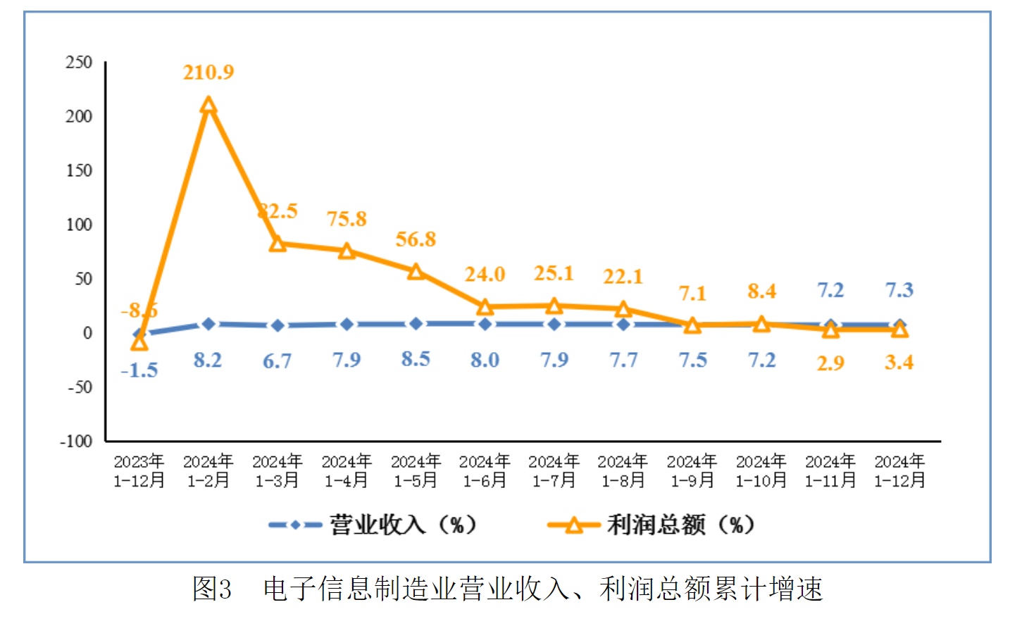 2024年,规模以上电子信息制造业实现营业收入16.19万亿元,同比增长7.3%;营业成本14.11万亿元,同比增长7.5%;实现利润总额6408亿元,同比增长3.4%;营业收入利润率为4.0%,较1-11月提高0.04个百分点。12月份,规模以上电子信息制造业营业收入1.74万亿元,同比增长8.4%。