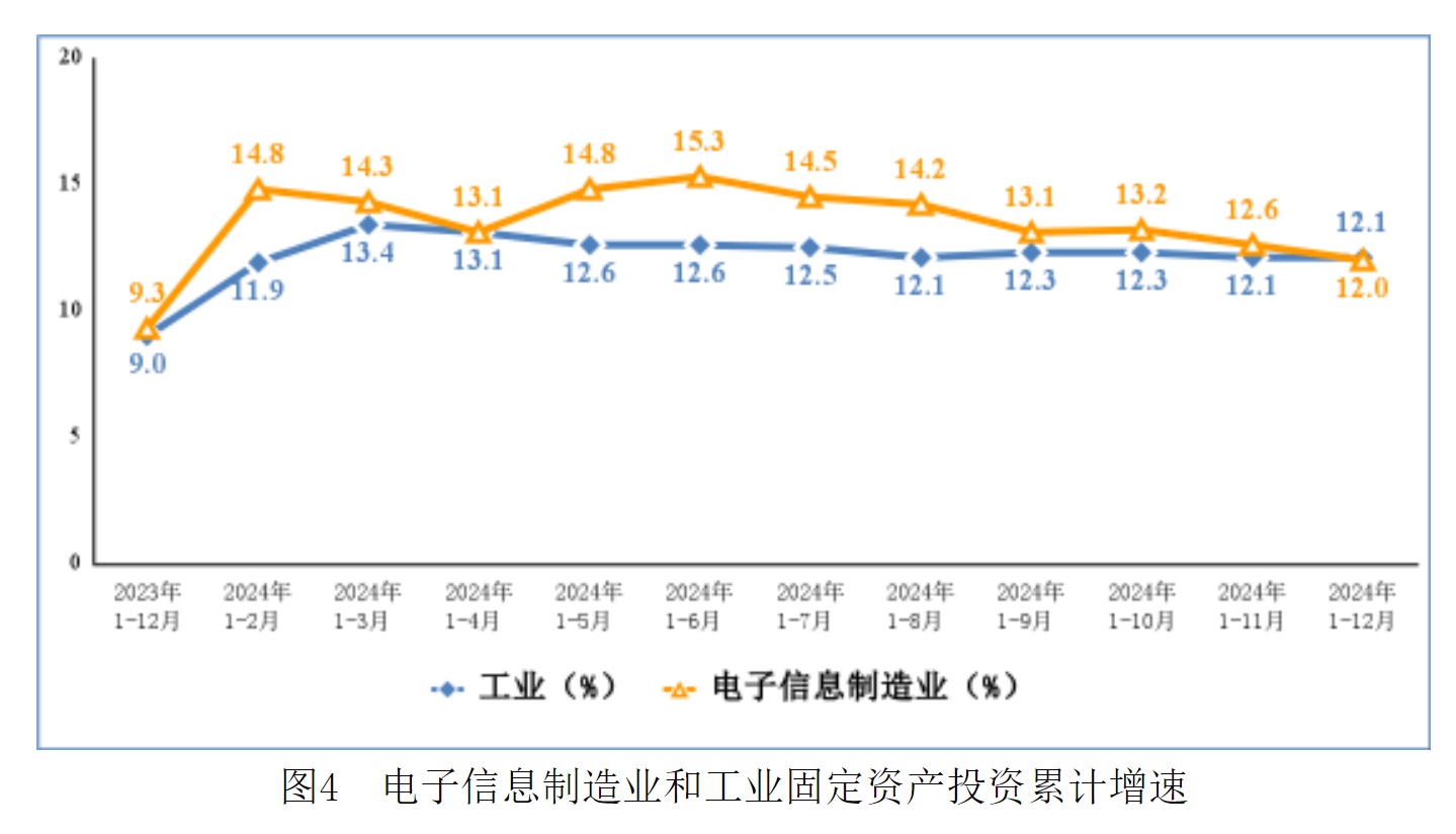 2024年,电子信息制造业固定资产投资同比增长12%,较1-11月回落0.6个百分点,比同期工业投资增速低0.1个百分点,比同期高技术制造业投资增速高5个百分点。