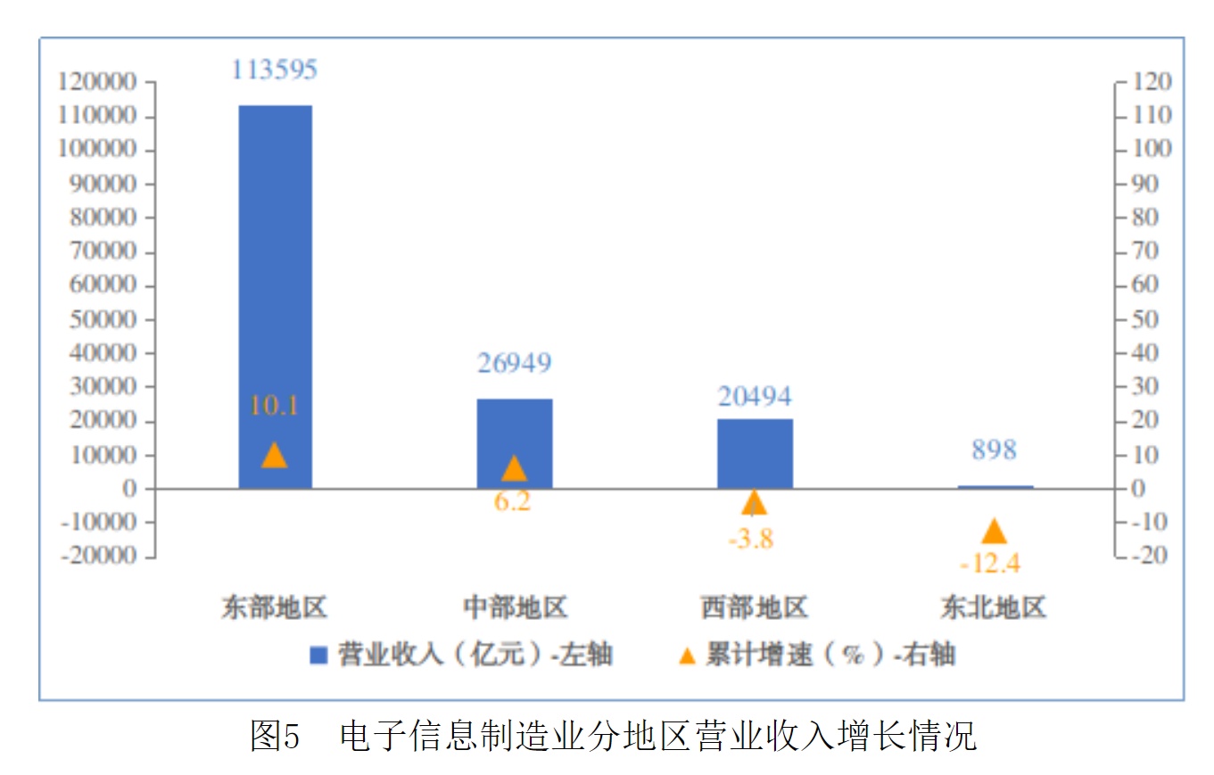 2024年,规模以上电子信息制造业东部地区实现营业收入113595亿元,同比增长10.1%,较1-11月提高0.2个百分点;中部地区实现营业收入26949亿元,同比增长6.2%,较1-11月回落0.5个百分点;西部地区实现营业收入20494亿元,同比下降3.8%,较1-11月提高0.6个百分点;东北地区实现营业收入897.8亿元,同比下降12.4%,较1-11月回升1.3个百分点。12月份,东部地区实现营业收入12536亿元,同比增长11.2%,中部地区实现营业收入2756亿元,同比增长1.5%;西部地区实现营业收入2036亿元,同比增长2%;东北地区实现营业收入99.6亿元,同比下降0.6%。