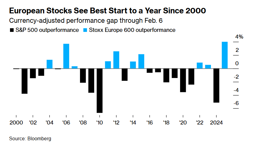 欧洲股市迎来自2000年以来最佳开局——截至2月6日的经过货币调整后的市场表现