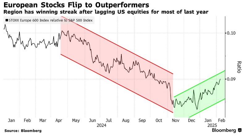 与此同时,衡量“美国七大科技巨头”的基准股票指数在2025年初持平,全球资金对于美国在人工智能技术以及基础设施建设方面主导地位的怀疑情绪逐渐上升。美国银行上个月的一项市场调查显示,投资者们对于欧洲股票的配置仓位从22%的净减持比例,转为净增持1%,这是全球资金在过去25年中对欧洲市场增持规模的第二大幅度。