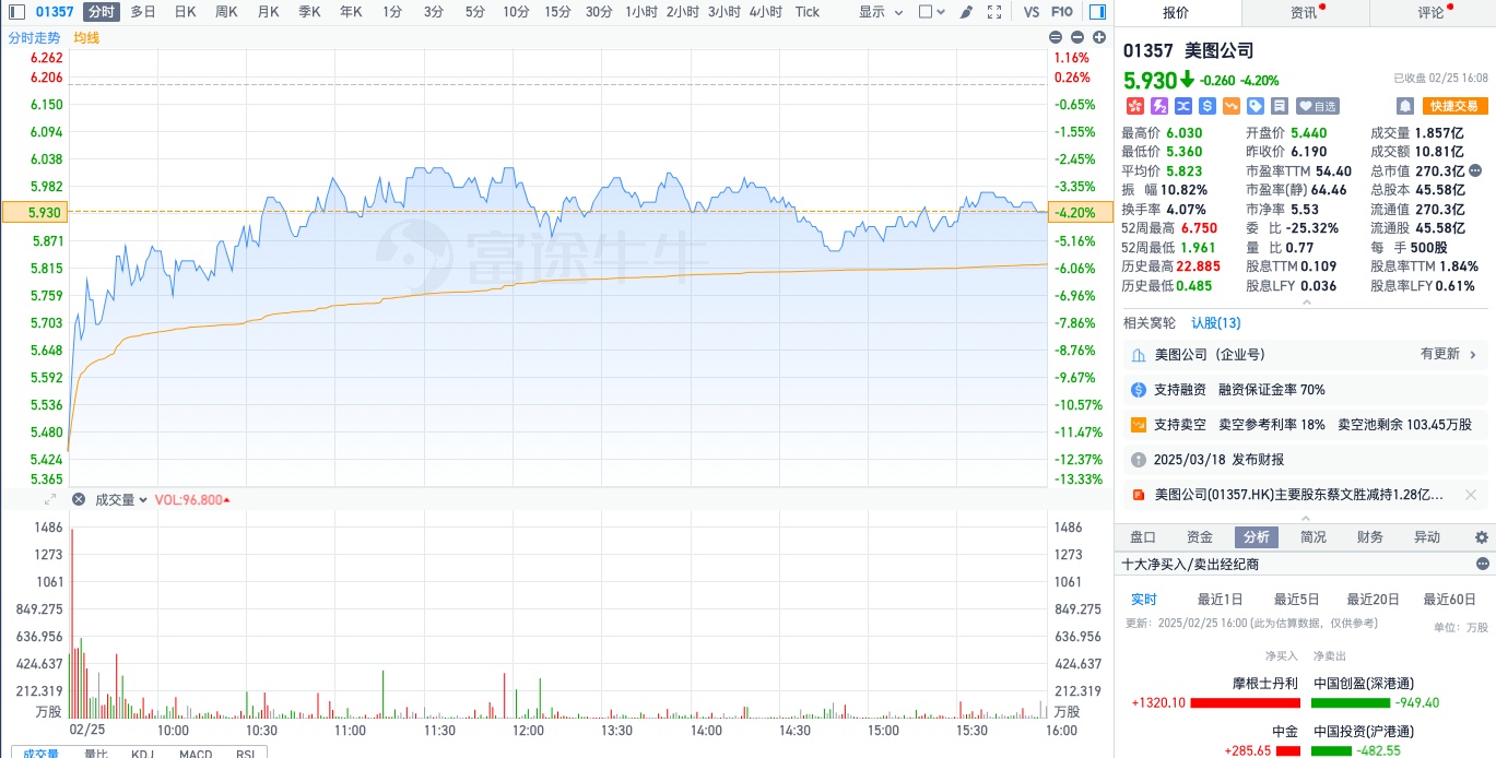 尽管美图公司在公告中强调公司创始人、董事长兼首席执行官吴泽源将于公司年度业绩公告发布和禁售期结束后 (即2025年3月18日后)于适当时候进一步增持公司股份,但股价还是应声下跌,以12%低开幅度引领港股AI概念股下跌。截至收盘,公司报5.92港元,成交量达1.857亿港元,跌幅达4.2%,总市值为270.3亿港元