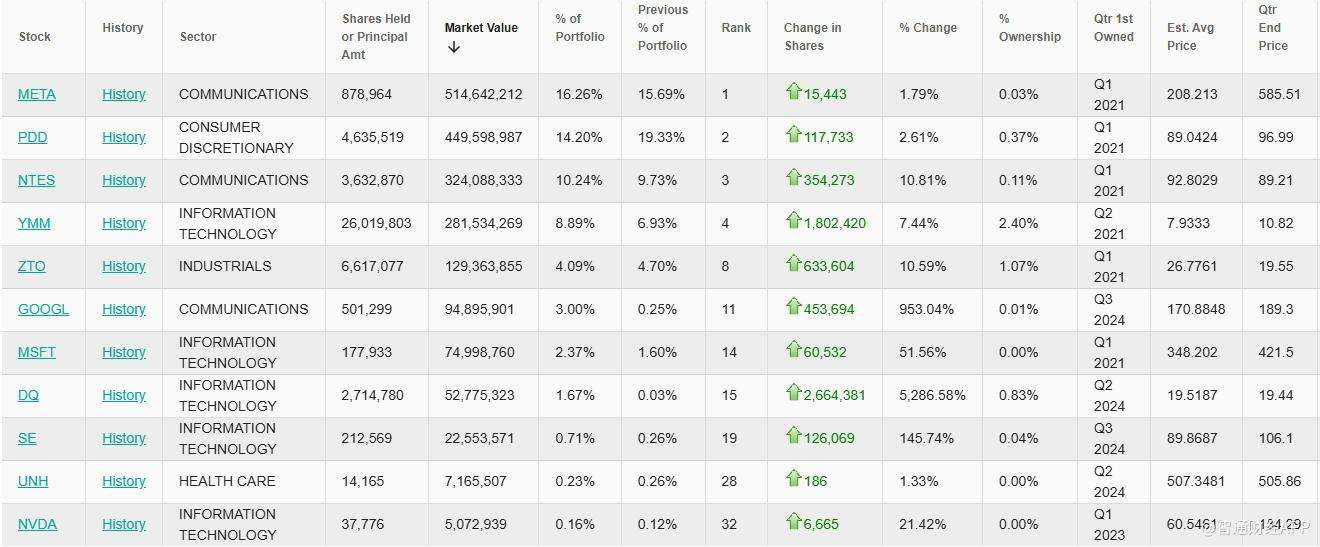 值得注意的是,景林资产在四季度显著增持了大全新能源(DQ.US),增持了2,664,381股,市值约5,277.5万美元,增长幅度高达5,286.58%,表明该机构对新能源材料行业的看好。此外,东南亚电商和游戏巨头SEA(SE.US)也被景林增持126,069股,总持仓212,569股,当前市值2,255.3万美元。