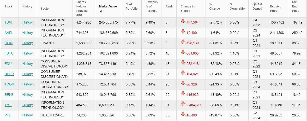 另外,该机构在去年四季度大幅减持了台积电(TSM.US)、新东方(EDU.US)、富途控股(FUTU.US)、腾讯音乐(TME.US)、优步(UBER)和贝壳(BEKE.US)等个股。其中,台积电被减持477,364股,降幅27.72%。新东方被减持582,416股,降幅32.16%。富途控股被减持601,633股,降幅31.92%。腾讯音乐被减持2,484,617股,降幅高达83.68%。优步被减持104,821股,降幅30.49%。贝壳被减持416,922股,降幅43.20%。