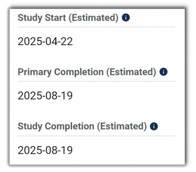 同时,来自ClinicalTrials网站的信息也显示,该研究计划于2025年4月底启动临床入组,预计在2025年8月结束。