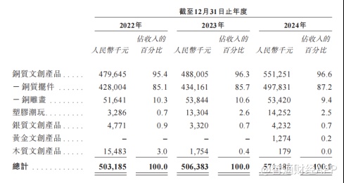 招股书显示,铜师傅成立于2013年,公司将铜作为核心材质,产品涵盖铜质文创产品、塑胶潮玩、银质文创产品及黄金文创产品等多个品类,其中铜质文创产品是产品矩阵的核心。2022-2024年,铜制文创产品收入分别占同期总收入的95.4%、96.3%及96.6%。