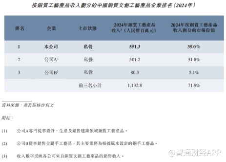根据弗若斯特沙利文报告,截至2024年12月31日止年度,公司在中国铜质文创工艺产品市场按总收入计位列第一,市场份额达35%。