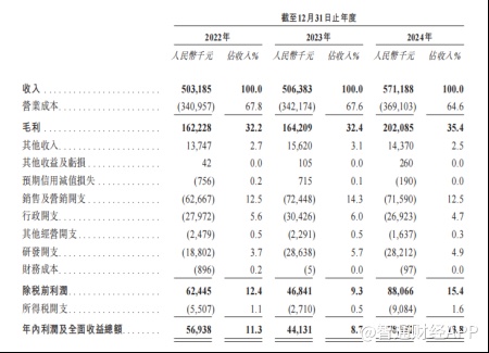 财务数据显示,在2022年、2023年、2024年,公司营业收入分别为5.03亿元、5.06亿元及5.71亿元;同期毛利率分别为32.2%、32.4%及35.4%;同期净利润分别为5693.8万元、4413.1万元、7898.2万元。