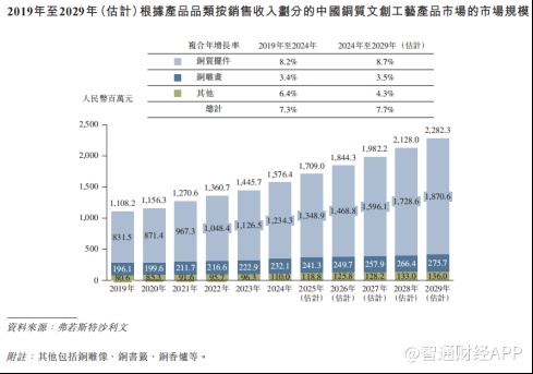 尽管中国文创工艺品市场在2024年规模已突破3540亿元,但铜制工艺品细分赛道却呈现“小而精”的特征。弗若斯特沙利文报告显示,中国铜质文创工艺产品市场2024年规模仅约16亿元,占文创大盘比重不足0.5%。尽管预计到2029年该市场规模将增长至22.82亿元,但增长规模相对有限。铜师傅虽以35%的市占率稳居行业龙头,然而过去三年营收体量始终在5亿元左右,明显受制于赛道容量。