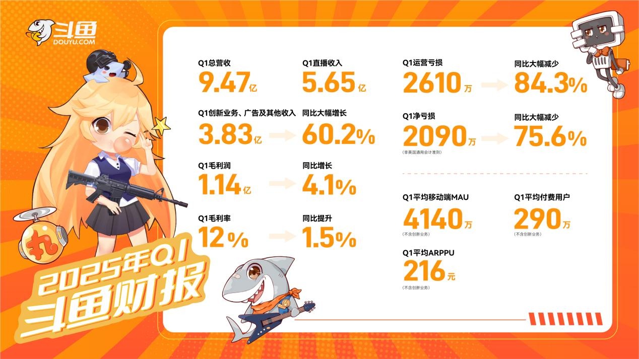 据斗鱼5月20日发布的第一季度财报显示,公司报告期内的收入为9.47亿元,毛利润为1.14亿元,同比增长4.1%,环比增长62.6%,毛利率为12%,同比提升1.5个百分点,环比提升5.9个百分点,且调整后净亏损为2090万元,同比大幅缩窄75.6%。