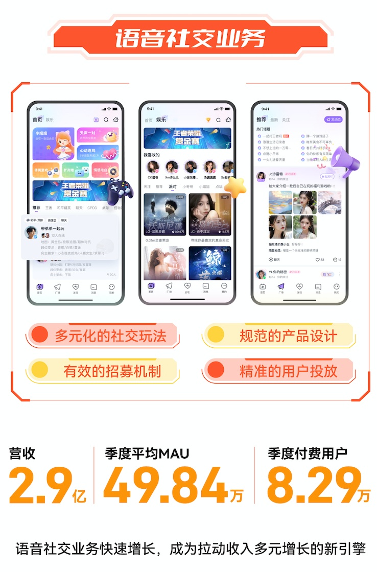 除游戏道具售卖之外,斗鱼报告期内的独立语音社交服务商业化进展顺利。相关服务在春节期间推出了一系列营销活动,并附之高效的流量分发,这有效提升了用户参与度和付费转化率。