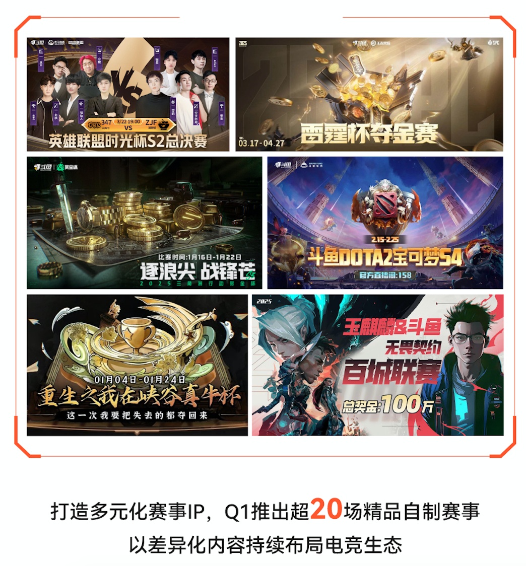报告期内,斗鱼持续打造斗鱼特色的平台赛事生态,不断夯实生态竞争壁垒,以优质内容提升平台的竞争力和市场地位。在官方赛事方面,斗鱼转播官方大型赛事活动近40场,包括王者荣耀KPL春季赛、穿越火线CFPL春季赛、无畏契约曼谷大师赛、CS2 Blast春季赛和里斯本公开赛等。