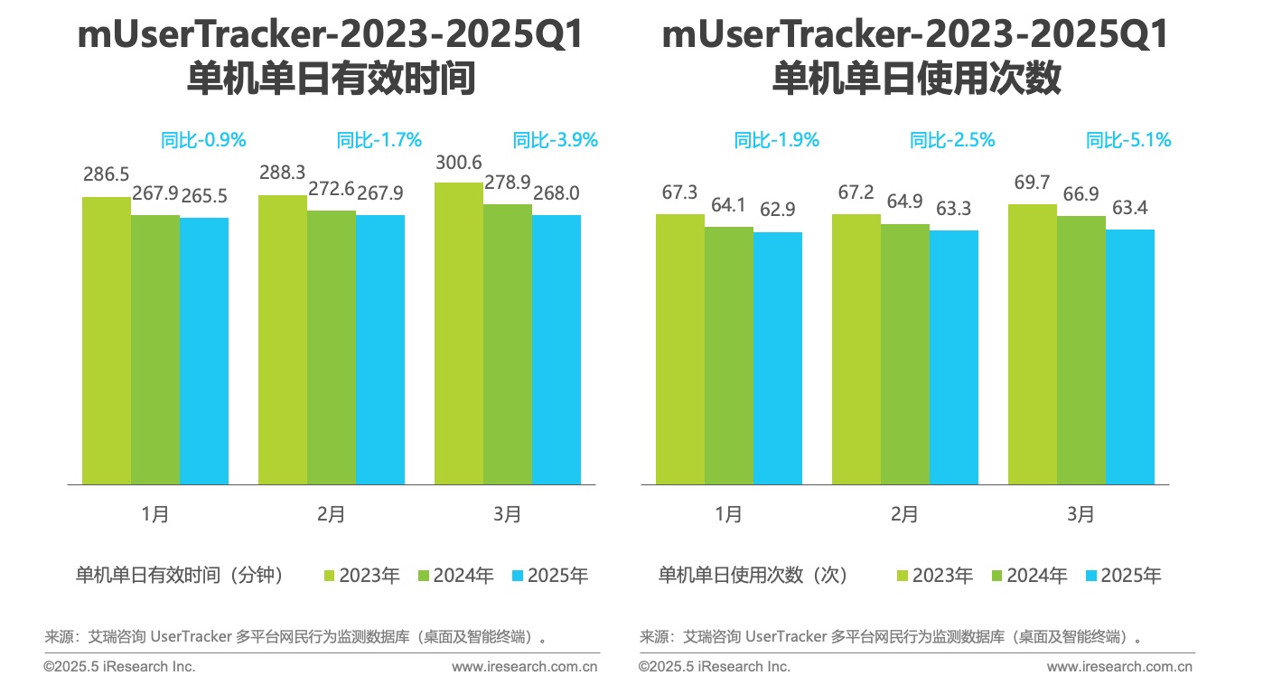 智通财经APP获悉,6月10日,艾瑞咨询发布2025Q1中国移动互联网流量季度报告。其中提到,2025年一季度,中国移动互联网月独立设备数均值同比增长2.6%,但单月环比增速较低,分别为0.27%、-0.03%、0.08%,市场需求趋稳,行业进入存量竞争深化阶段。