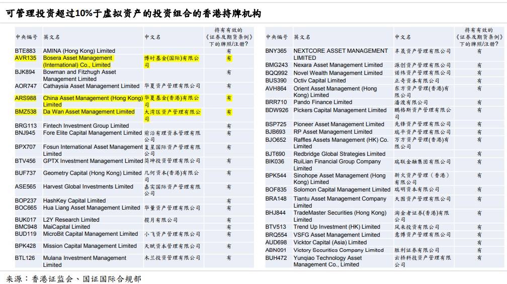 二是,传统券商升级牌照,即1号牌照升级,如哈富证券、天风国际获批通过综合账户提供虚拟资产交易服务,直接对接持牌交易所;及4号牌照升级(机构可提供虚拟资产投资咨询)和9号牌照升级(资管机构可管理虚拟资产占比超10%的基金)。